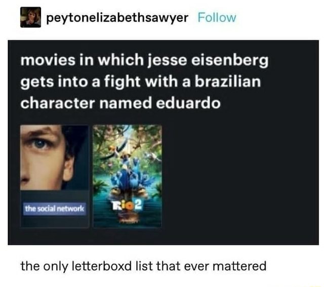 Peytonelizabethsawyer Movies In Which Jesse Eisenberg Gets Into A Fight With A Brazilian Character Named Eduardo The Only Letterboxd List That Ever Mattered Ifunny - After fleeing from a stage show, the illusionists (jesse eisenberg, woody harrelson) known as the four horsemen find themselves in more trouble in macau, china.